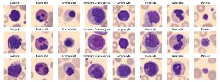 This dataset contains microscopic images of eight different types of blood cells stained purple.